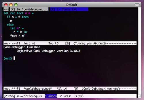 30分プログラム、その445。ふと思いついてOCamlDebugを試してみたら、予想以上に熱かった。ステップ実行や変数表示、ブレイクポイントなど普通の機能があるのはもちろんのこと、1ステップ戻るなんてことができる。逆方向に実行って、熱すぎるだろ・・・。 デ…